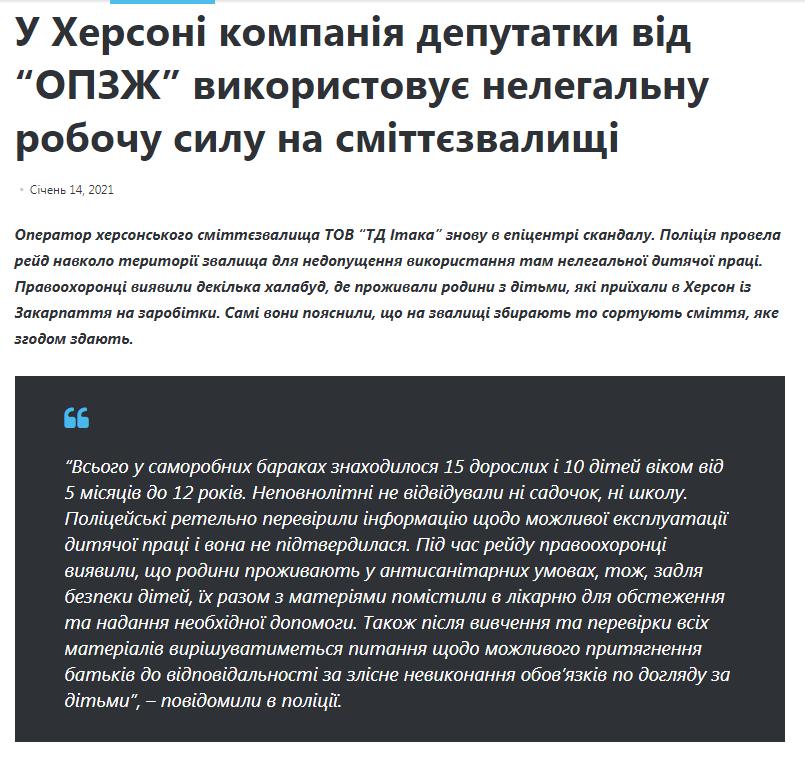В материале издания говорится о причастности компании, ранее принадлежавшей Алене Ротовой, к организации нелегальной детского труда на городской свалке. Согласно данным системы бизнес-аналитики youcontrol.com.ua, Ротова вышла из основателей компании 2 сентября 2020.