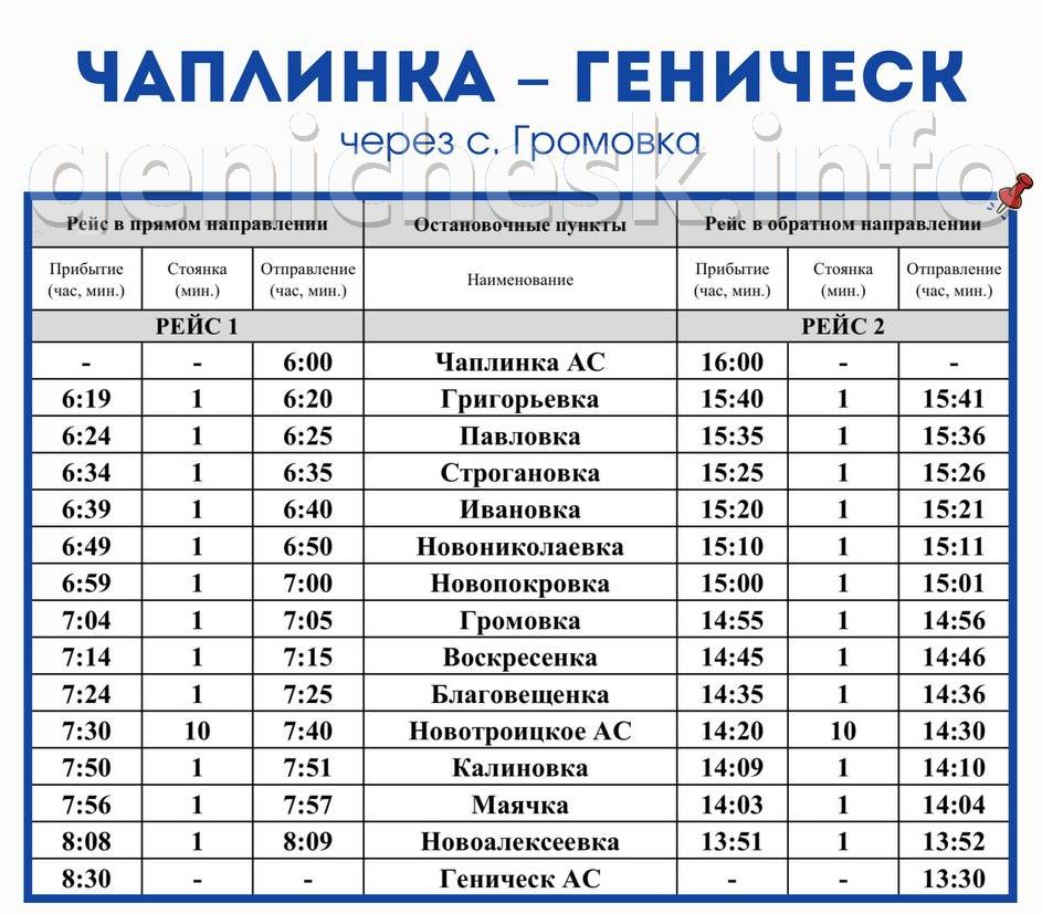Расписание движения автобуса № 524 Чаплинка – Геническ (через с. Громовка)