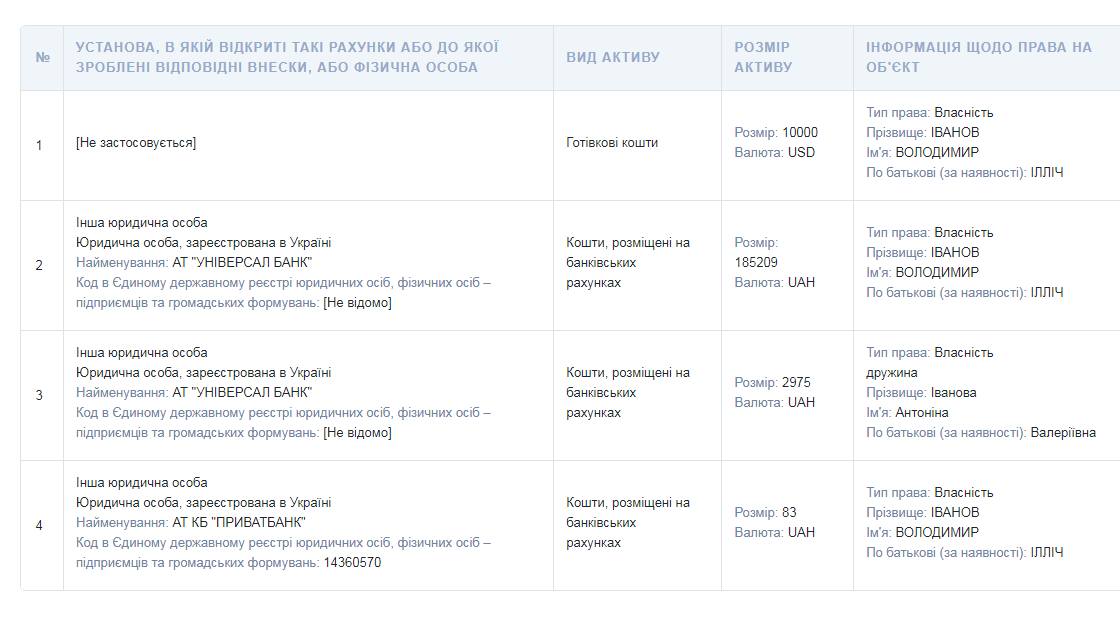 Декларация депутата ВРУ Владимира Иванова за прошлый год
