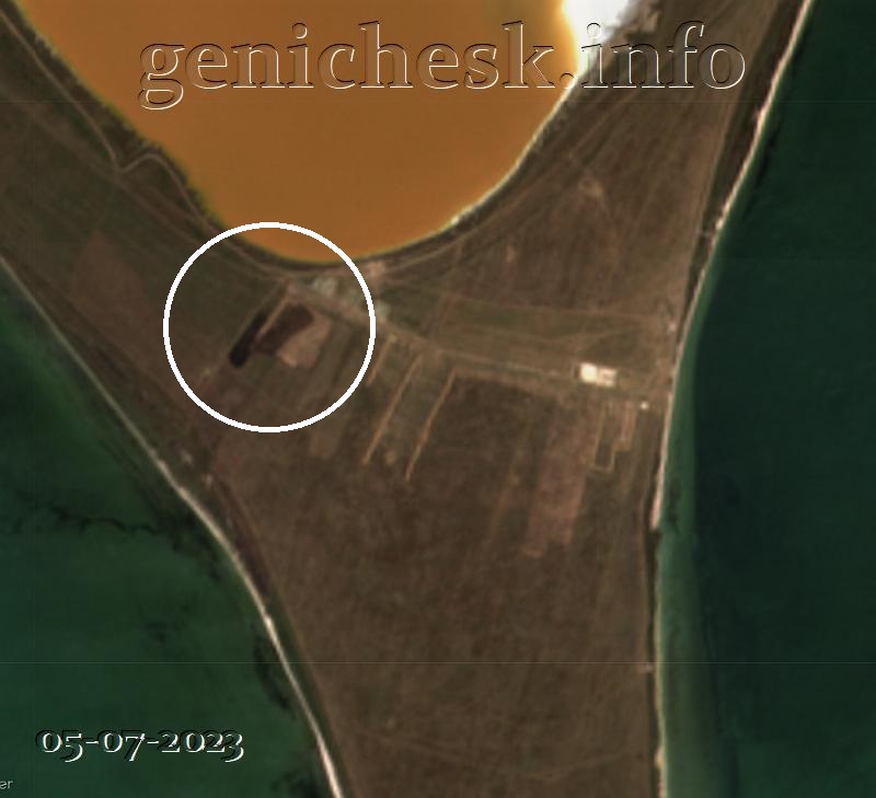 На спутниковом снимке от 5 июля 2023 года явно видны два черных пятна предположительно от горения. Первое пятно располагалось внутри обвалованного квадрата, второе, новое, за его пределами.
