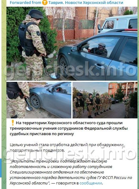 В одном из Telegram-каналов появилась новость о том, что в Геническом районе российские структуры проводят учения на территории «Херсонского областного суда». К сообщению прилагались фотографии, на которых был изображен объект, внешне больше похожий на курортный пансионат, чем на административное здание судебного органа.