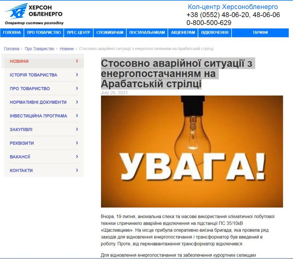 Также Херсоноблэнерго в своем сообщении выразил удивление тем что летом вдруг стало жарко и поэтому заранее даже не подумали предусмотреть перераспределение нагрузок и соответственно необходимость в дополнительном трансформаторе и оперативной схемы резервирования энергоснабжения поселков курортной Арабатской стрелки.