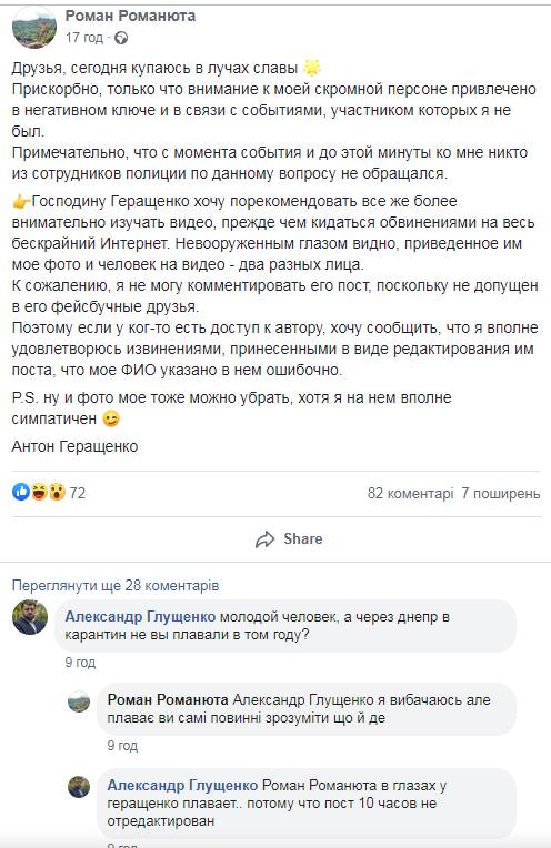 Стоит отметить, что ранее заместитель главы МВД Антон Геращенко заявил, что полиция за этого инцидента объявила в розыск Романюту Романа Александровича 1978 года, то есть совсем другого человека.