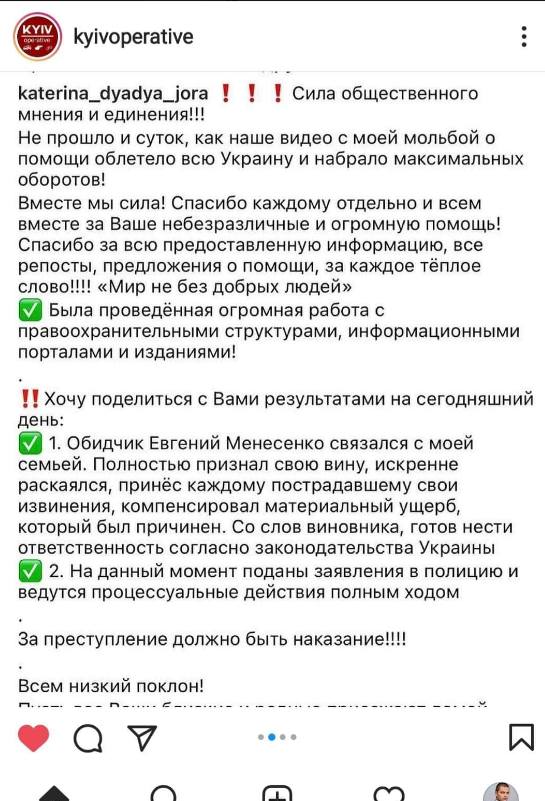 Водитель автомобиля Volkswagen с надписью на номерном знаке «LEGIONER», который подрезал на дороге машину Ford и напал с битой на Екатерину Деряги с мужем, которые находились в ней, связался с пострадавшими и попросил прощения. Им оказался Евгений Менесенко.