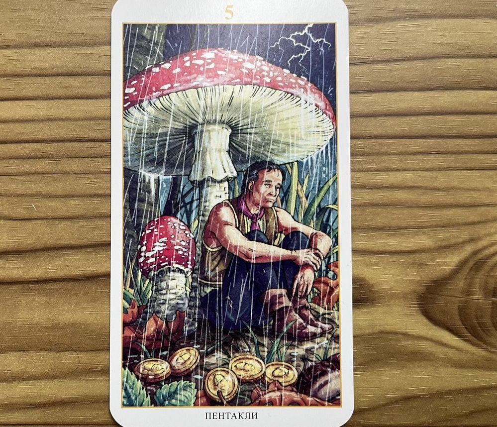 «5 Пентаклей» — карта сложностей, но и карта внутреннего роста. В ней заложено предупреждение, что трудности неизбежны, но в то же время существуют возможности найти поддержку и восстановиться. Гроза и дождь рано или поздно заканчиваются, и человек, укрывшийся под мухомором, найдёт силы двигаться вперёд.