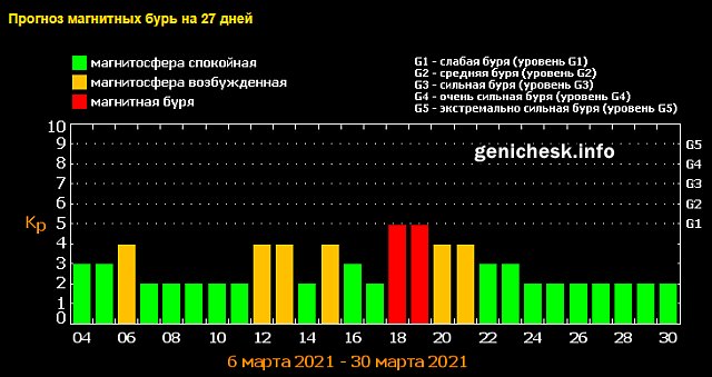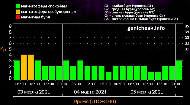 Сегодня, 3 марта 2021 года, продолжается вчерашняя магнитная буря. После чего последующие два дня будут в зеленом спокойном секторе.