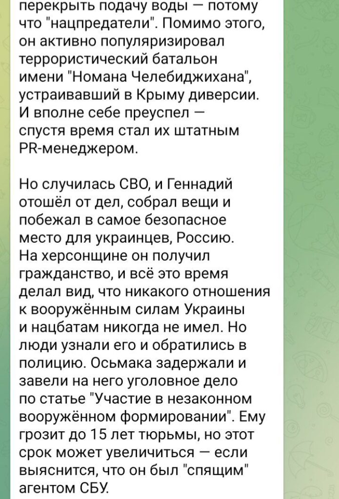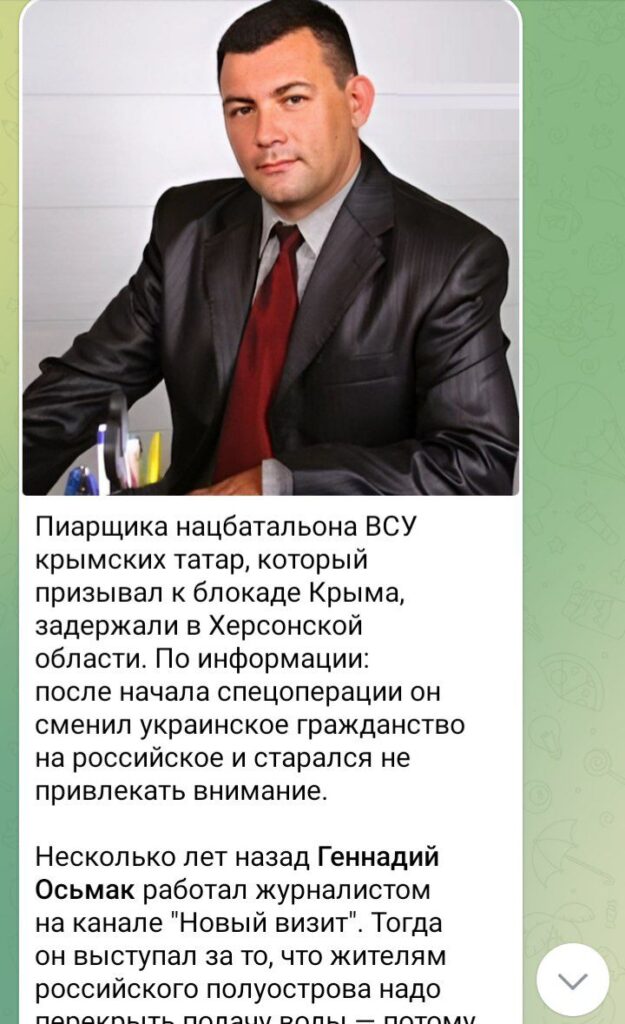 Здесь следует отметить что в данном случае вина Геннадия Осьмака если такая есть может быть, с точки зрения здравого смысла, в освещении событий в Геническом районе Херсонщины до российского вторжения. Абсолютно логичным можно считать тот факт что деятельность крымско-татарского батальона не могла пройти мимо внимания любого журналиста в Геническе.