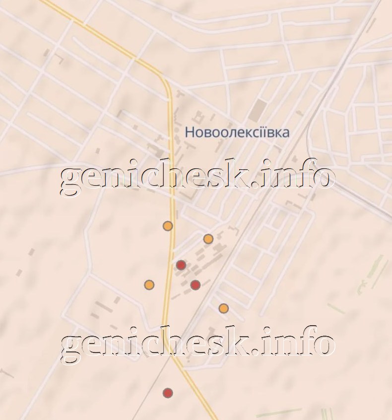 Схема пожаров в Новоалексеевке вследствии взрыва складов российской армии в районе элеватора (красным — свежие пожары, от 3 до 6 часов давностью). Оранжевые точки — ночные пожары.