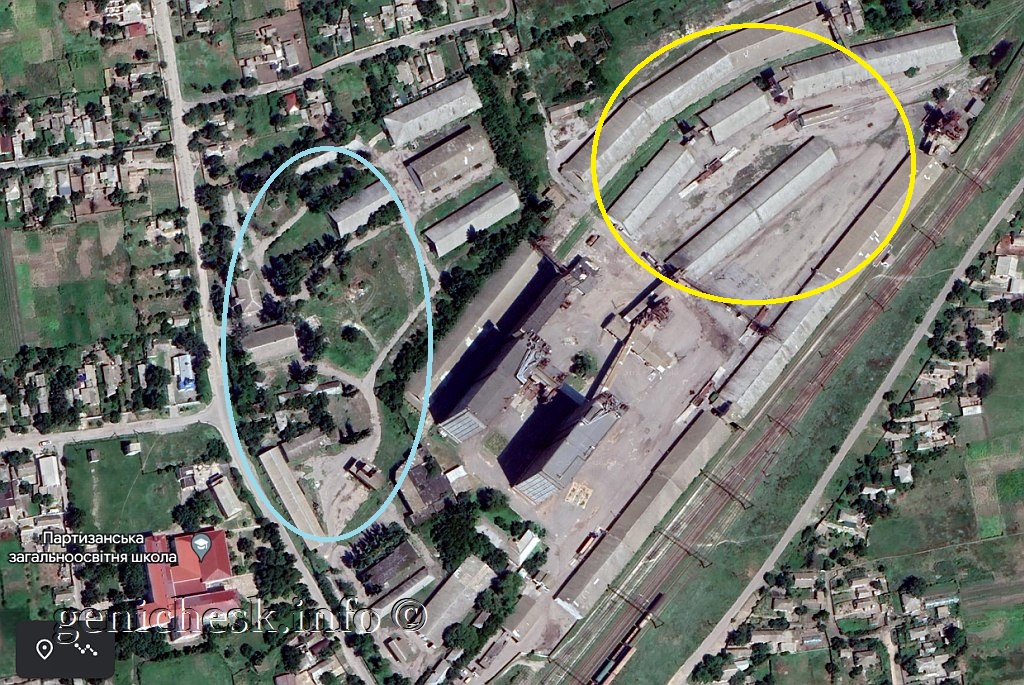 Как известно в Геническом районе в пгт.Рыково (Партизаны) были взорваны ангары с боеприпасами на территории Партизанского элеватора (желтый овал)