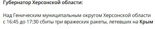 Вчера 22 октября 2023 года, по сообщению губернатора Генической области Херсонщины над ее территорией были сбиты три украинские ракеты.