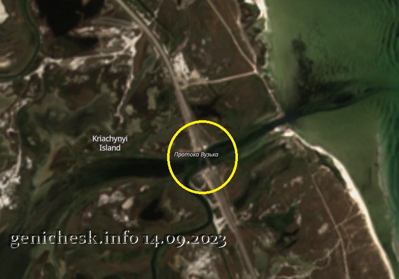 На снимках видно что понтонная переправа в Геническе практически убрана. Связано это, по видимому, с сообщением недельной давности о полном восстановлении «второго» моста на Арабатскую стрелку