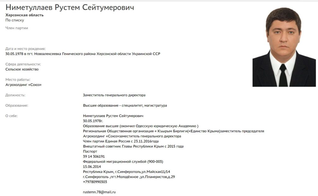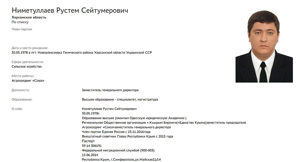 Ниметуллаев Рустем Сейтумерович Херсонская область По списку Член партии Дата и место рождения: 30.05.1978 в пгт. Новоалексеевка Генического района Херсонской области Украинской ССР Сфера деятельности: Сельское хозяйство Место работы: Агрохолдинг «Союз» Должность: Заместитель генерального директора Образование: Высшее образование — специалитет, магистратура О себе: Ниметуллаев Рустем Сейтумерович