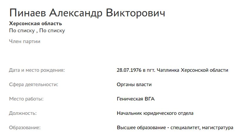 Пинаев Александр Викторович Херсонская область По списку По списку Член партии Дата и место рождения: 28.07.1976 в пгт. Чаплинка Херсонской области Сфера деятельности: Органы власти Место работы: Геническая ВГА Должность: Начальник юридического отдела Образование: Высшее образование — специалитет, магистратура