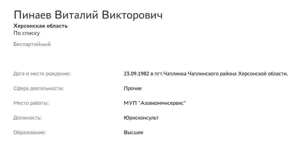 Пинаев Виталий Викторович Херсонская область По списку Беспартийный Дата и место рождения: 23.09.1982 в пгт.Чаплинка Чаплинского района Херсонской области. Сфера деятельности: Прочие Место работы: МУП «Азовкоммнсервис» Должность: Юрисконсульт Образование: Высшее