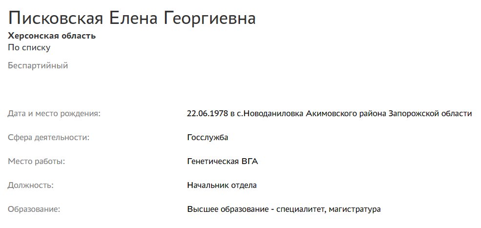 Писковская Елена Георгиевна Херсонская область По списку Беспартийный Дата и место рождения: 22.06.1978 в с.Новоданиловка Акимовского района Запорожской области Сфера деятельности: Госслужба Место работы: Геническая ВГА Должность: Начальник отдела Образование: Высшее образование — специалитет, магистратура