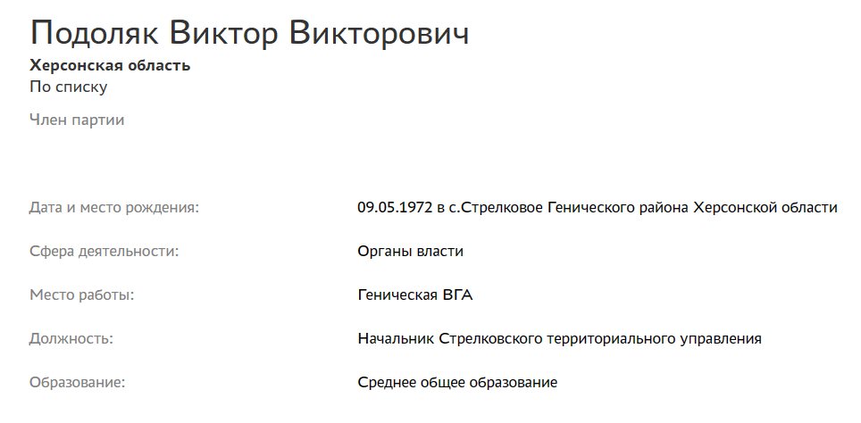 Подоляк Виктор Викторович Херсонская область По списку Член партии Дата и место рождения: 09.05.1972 в с.Стрелковое Генического района Херсонской области Сфера деятельности: Органы власти Место работы: Геническая ВГА Должность: Начальник Стрелковского территориального управления Образование: Среднее общее образование