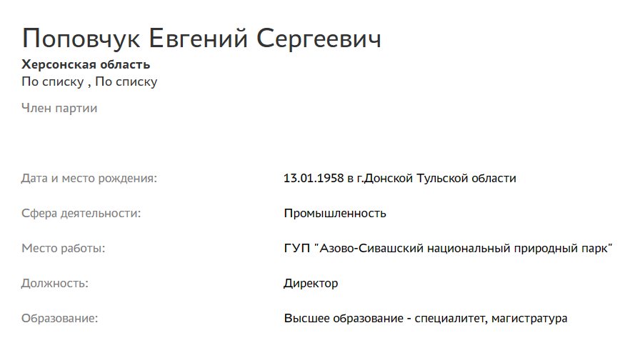 Поповчук Евгений Сергеевич Херсонская область По списку По списку Член партии Дата и место рождения: 13.01.1958 в г.Донской Тульской области Сфера деятельности: Промышленность Место работы: ГУП «Азово-Сивашский национальный природный парк» Должность: Директор Образование: Высшее образование — специалитет, магистратура