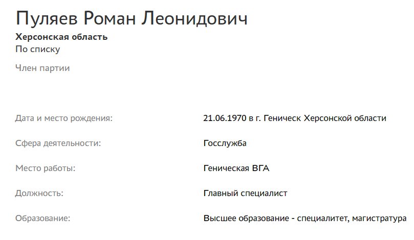 Пуляев Роман Леонидович Херсонская область По списку Член партии Дата и место рождения: 21.06.1970 в г. Геническ Херсонской области Сфера деятельности: Госслужба Место работы: Геническая ВГА Должность: Главный специалист Образование: Высшее образование — специалитет, магистратура