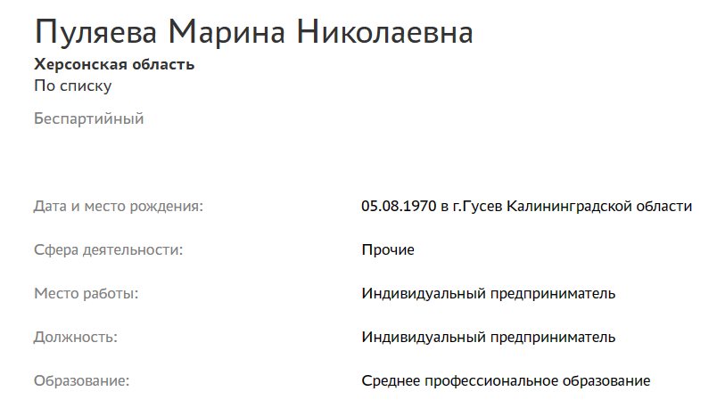 Пуляева Марина Николаевна Херсонская область По списку Беспартийный Дата и место рождения: 05.08.1970 в г.Гусев Калининградской области Сфера деятельности: Прочие Место работы: Индивидуальный предприниматель Должность: Индивидуальный предприниматель Образование: Среднее профессиональное образование