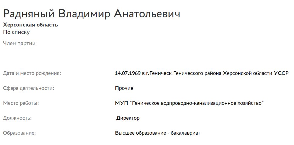 Радняный Владимир Анатольевич Херсонская область По списку Член партии Дата и место рождения: 14.07.1969 в г.Геническ Генического района Херсонской области УССР Сфера деятельности: Прочие Место работы: МУП «Геническое водпроводно-канализационное хозяйство» Должность: Директор Образование: Высшее образование — бакалавриат
