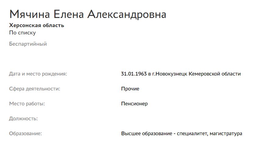 Мячина Елена Александровна Херсонская область По списку Беспартийный Дата и место рождения: 31.01.1963 в г.Новокузнецк Кемеровской области Сфера деятельности: Прочие Место работы: Пенсионер Должность: Образование: Высшее образование — специалитет, магистратура