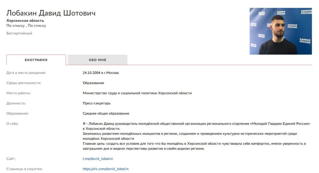 О себе: Я — Лобакин Давид руководитель молодёжной общественной организации регионального отделения «Молодой Гвардии Единой России» в Херсонской области.