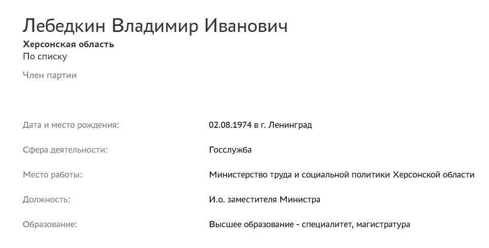Лебедкин Владимир Иванович Херсонская область По списку Член партии Дата и место рождения: 02.08.1974 в г. Ленинград Сфера деятельности: Госслужба Место работы: Министерство труда и социальной политики Херсонской области Должность: И.о. заместителя Министра Образование: Высшее образование — специалитет, магистратура