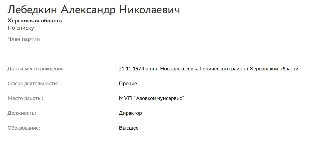 Лебедкин Александр Николаевич Херсонская область По списку Член партии Дата и место рождения: 21.11.1974 в пгт. Новоалексеевка Генического района Херсонской области Сфера деятельности: Прочие Место работы: МУП «Азовкоммунсервис» Должность: Директор Образование: Высшее