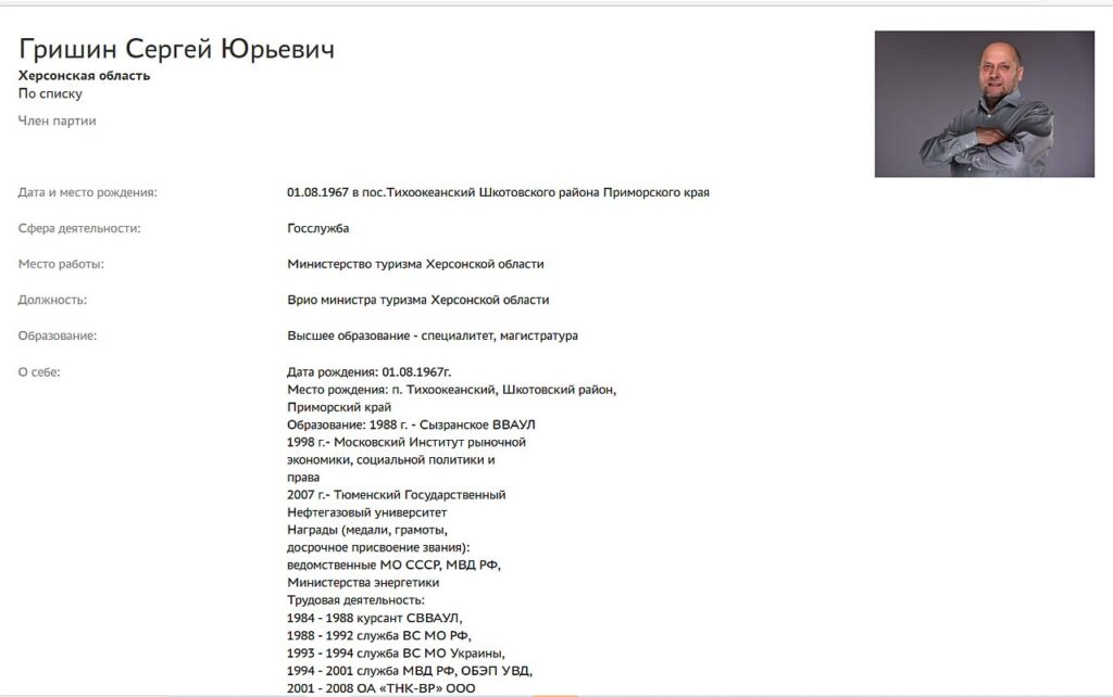 Гришин Сергей Юрьевич Херсонская область По списку Член партии Дата и место рождения: 01.08.1967 в пос.Тихоокеанский Шкотовского района Приморского края Сфера деятельности: Госслужба Место работы: Министерство туризма Херсонской области Должность: Врио министра туризма Херсонской области Образование: Высшее образование — специалитет, магистратура О себе: Дата рождения: 01.08.1967г.