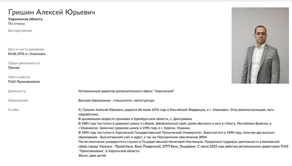 Гришин Алексей Юрьевич Херсонская область По списку Беспартийный Дата и место рождения: 04.06.1976 в г.Ульяновск Сфера деятельности: Прочие Место работы: ПАО Промсвязьбанк Должность: Региональный директор дополнительного офиса «Херсонский» Образование: Высшее образование — специалитет, магистратура