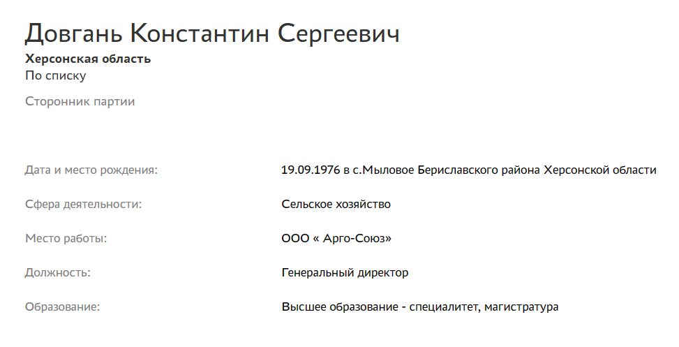 Довгань Константин Сергеевич Херсонская область По списку Сторонник партии Дата и место рождения: 19.09.1976 в с.Мыловое Бериславского района Херсонской области Сфера деятельности: Сельское хозяйство Место работы: ООО « Арго-Союз» Должность: Генеральный директор Образование: Высшее образование — специалитет, магистратура