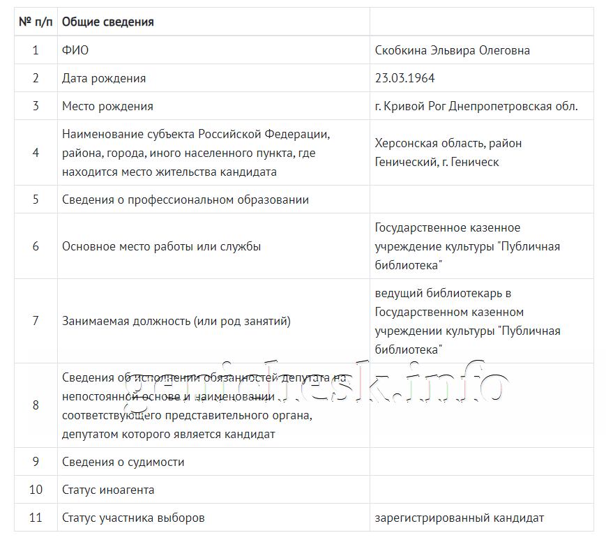 Скобкина Эльвира Олеговна — ведущий библиотекарь в «Публичной библиотеке» г.Геническ — зарегестрированный кандидат в депутаты в Херсонскую областную Думу от КПРФ