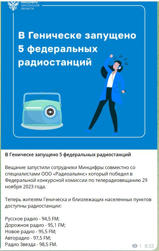 Прекрасно понимая что в условиях войны на оккупированных территориях необходимо создавать и выращивать в умах населения необходимые им настроения и проводить информационную обработку российское минцифры в сумме в Генической области уже перенасытили информпространство введя в строй уже пять своих широковещательных радиостанций.