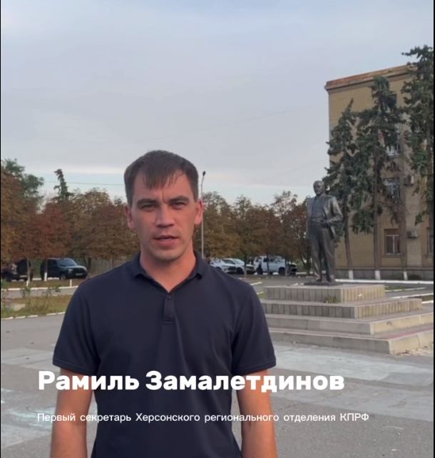 Коммунист из России Рамиль Замалетдинов первый секретарь Херсонского регионального отделения КПРФ, уроженец г.Ульяновск, возглавляет список херсонских коммунистов — командирован КПРФ в Херсонскую область — своих коммунистов способных возглавить на Херсонщине региональное отделение там не нашлось.