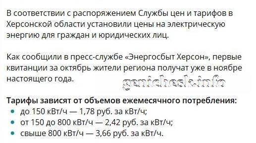 В принципе суммы для оплаты электроэнергии равны аналогичным тарифам при Украине, когда геничанам до войны приходилось платить за свет по 250-300 гривен.